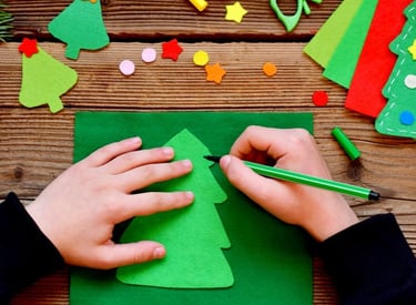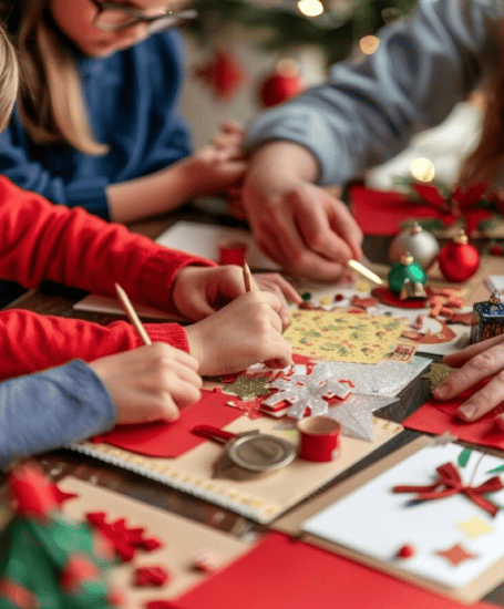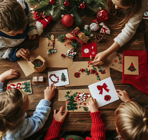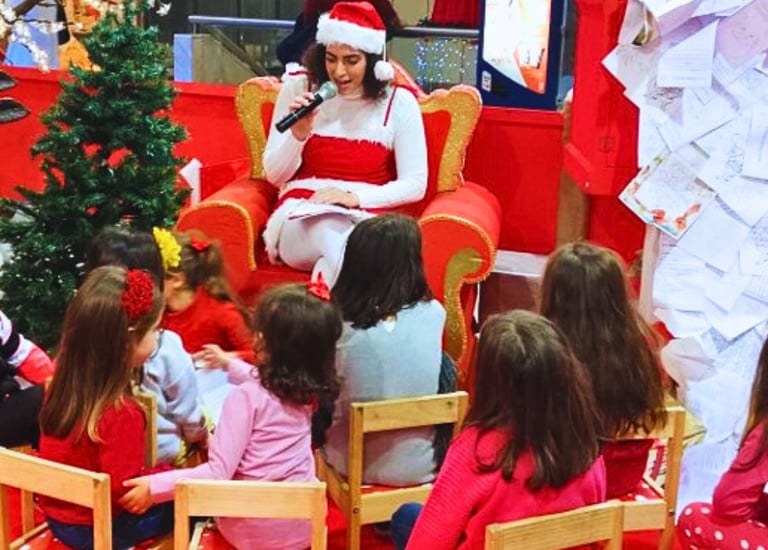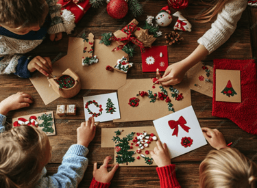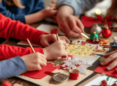 Un' accogliente piazza decorata con luci scintillanti e festoni colorati. Al centro svetta un Babbo Natale gigante, sorridente e circondato da un paesaggio invernale incantato. Intorno a lui, ci sono alberi di Natale addobbati con palline, nastri e luci. Accanto, un laboratorio festivo per bambini è allestito con tavoli ricoperti di materiali per creare lavoretti natalizi: carta colorata, glitter, adesivi e colla. I piccoli artisti possono divertirsi a realizzare biglietti d'auguri, decorazioni e piccoli regali, mentre la musica natalizia riempie l’aria di gioia e allegria. Un' atmosfera magica che rende indimenticabile l'evento!